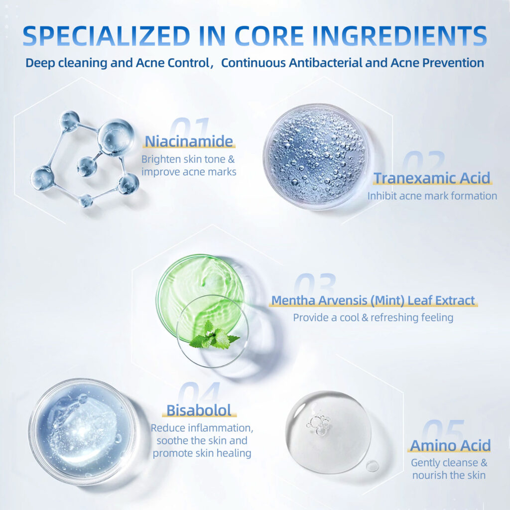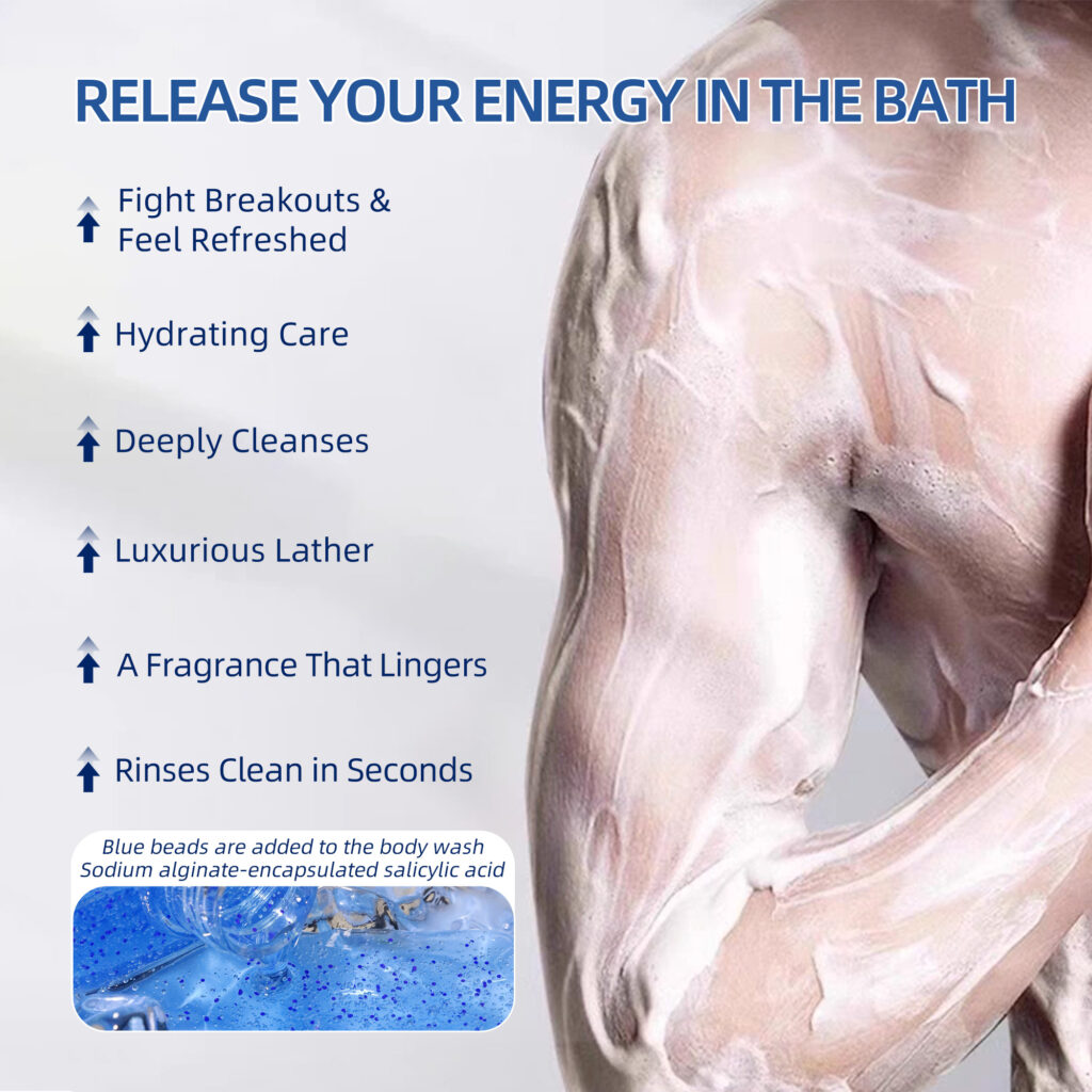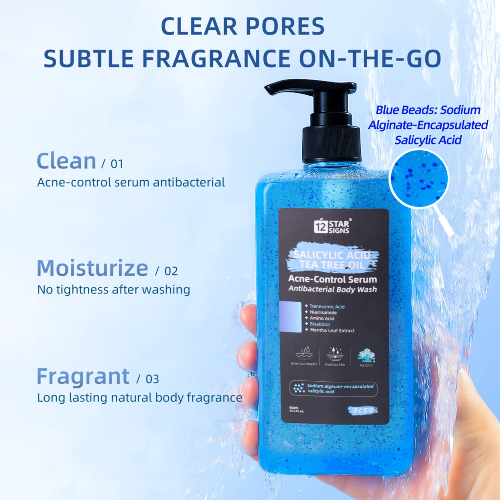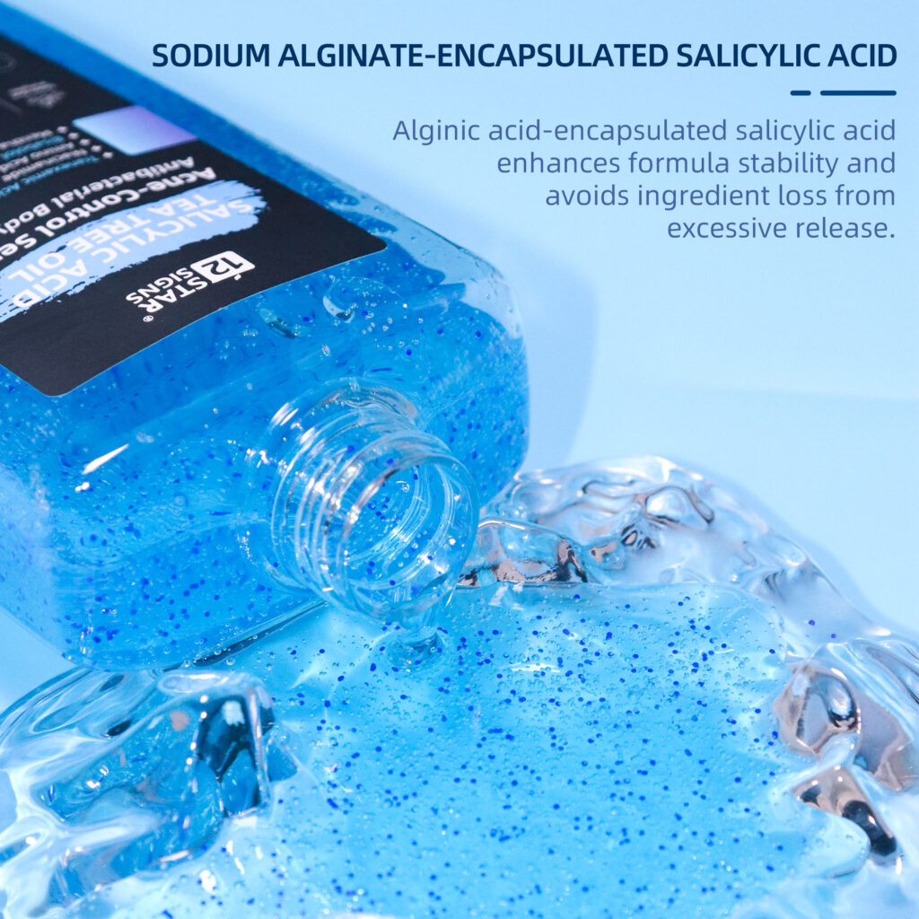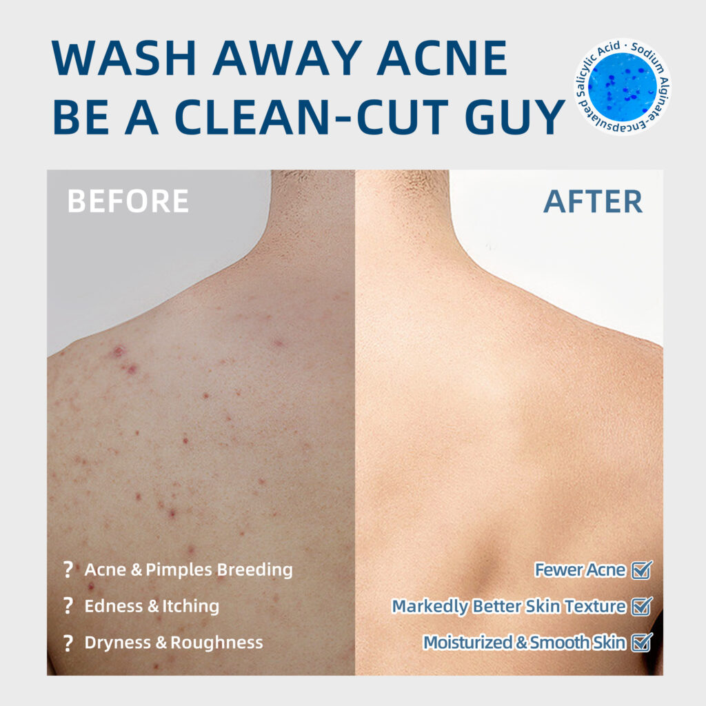This body wash can effectively clean the skin, eliminate skin acne, and bring a refreshing experience to the skin during bathing.Alginic acid-encapsulated salicylic acid enhances formula stability and avoids ingredient loss from excessive release.
