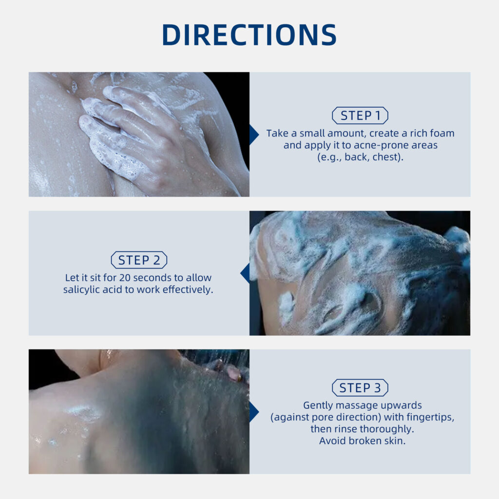 1. Take a small amount, create a rich foam, and apply it to acne-prone areas (e.g., back, chest).